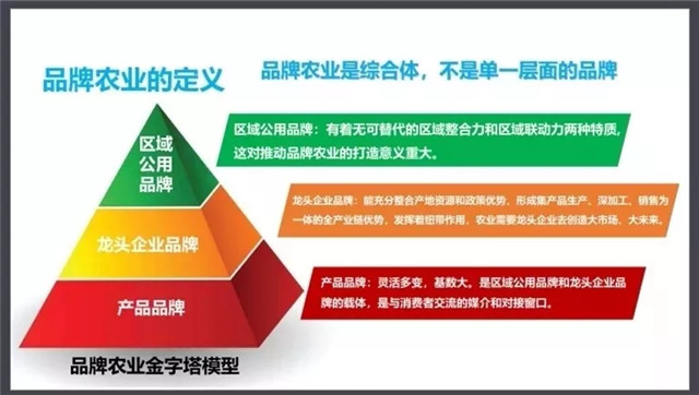 李志起表示,做好品牌農(nóng)業(yè),并非一朝一夕,而是系統(tǒng)性工程。品牌農(nóng)業(yè)是綜合體,不是單一層面的品牌。品牌農(nóng)業(yè)應(yīng)是由區(qū)域公用品牌、龍頭企業(yè)品牌和產(chǎn)業(yè)品牌組成的由上至下的三級金字塔。